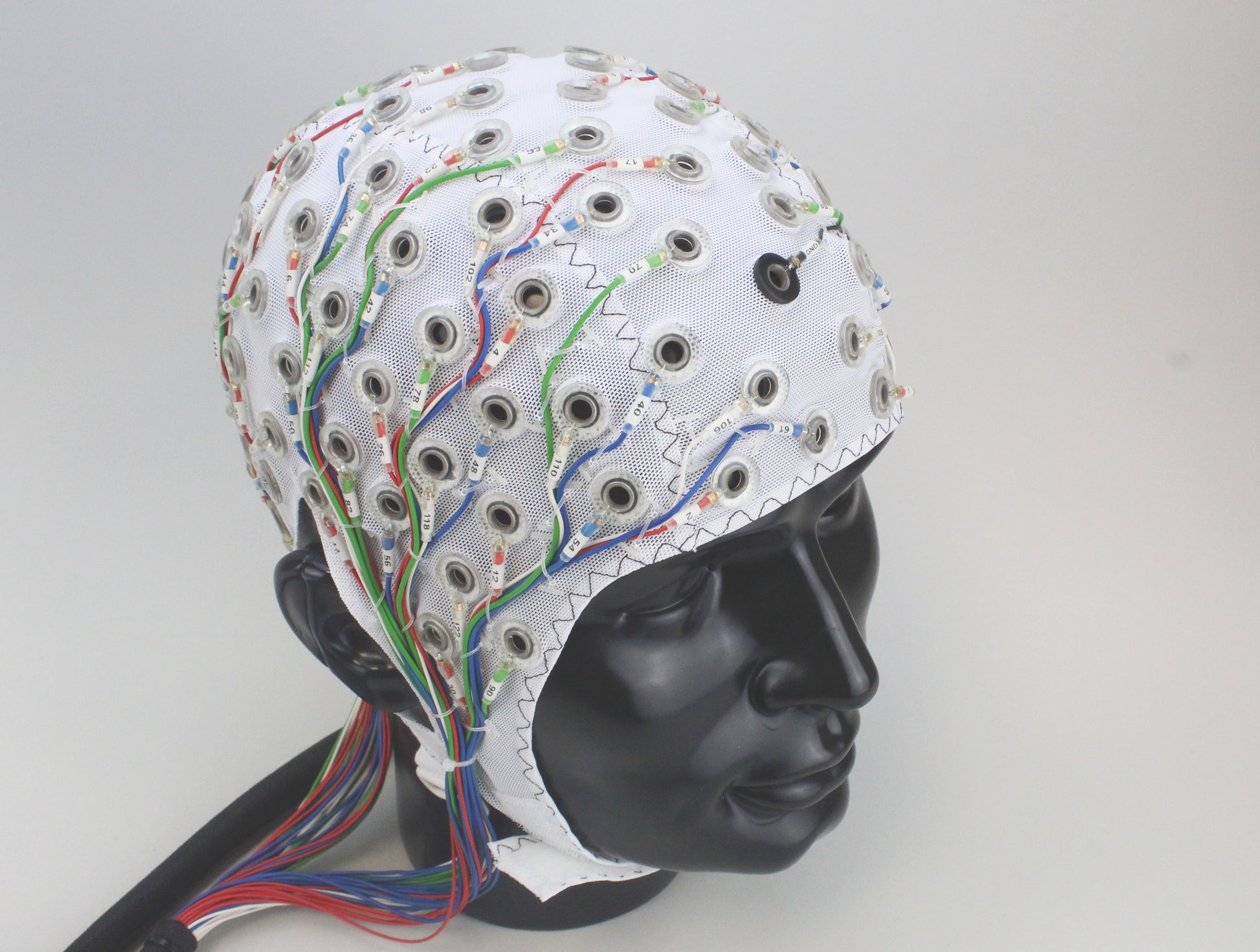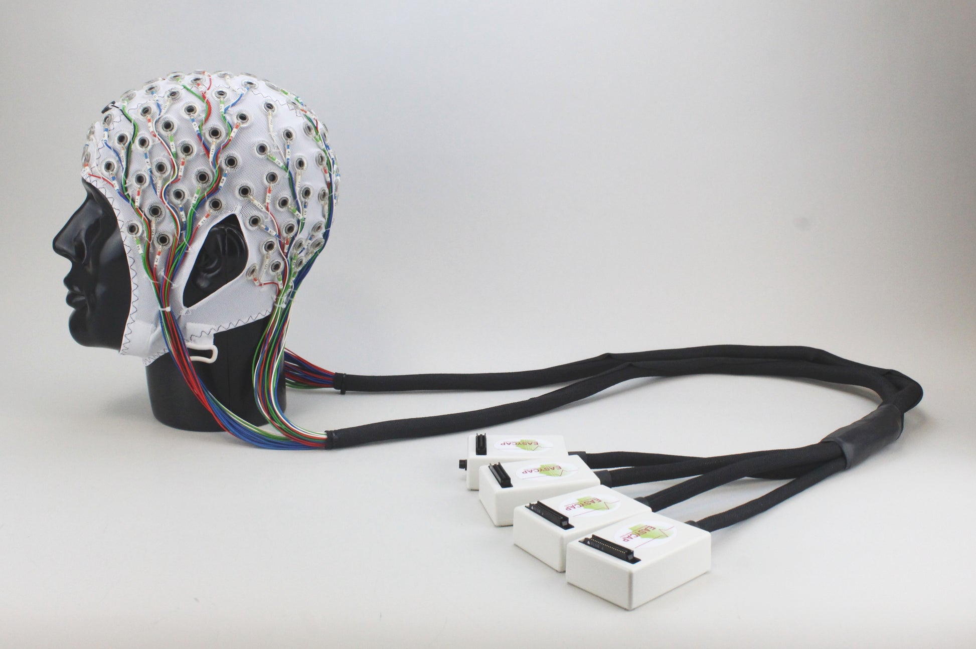 Complete EEG recording cap with 128 (127 signal electrodes, ground) built-in Multitrode electrodes. Reference is freely selectable.