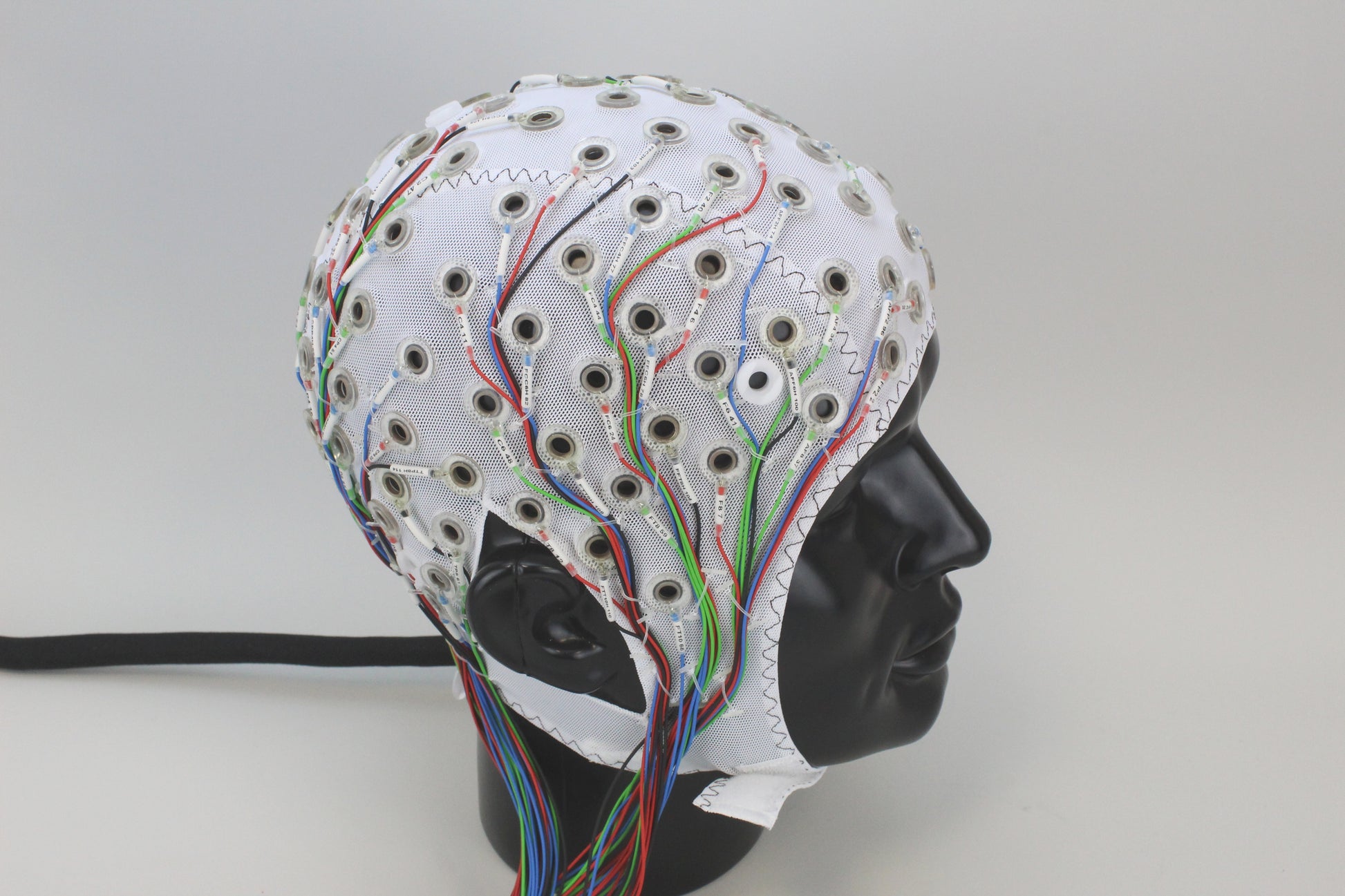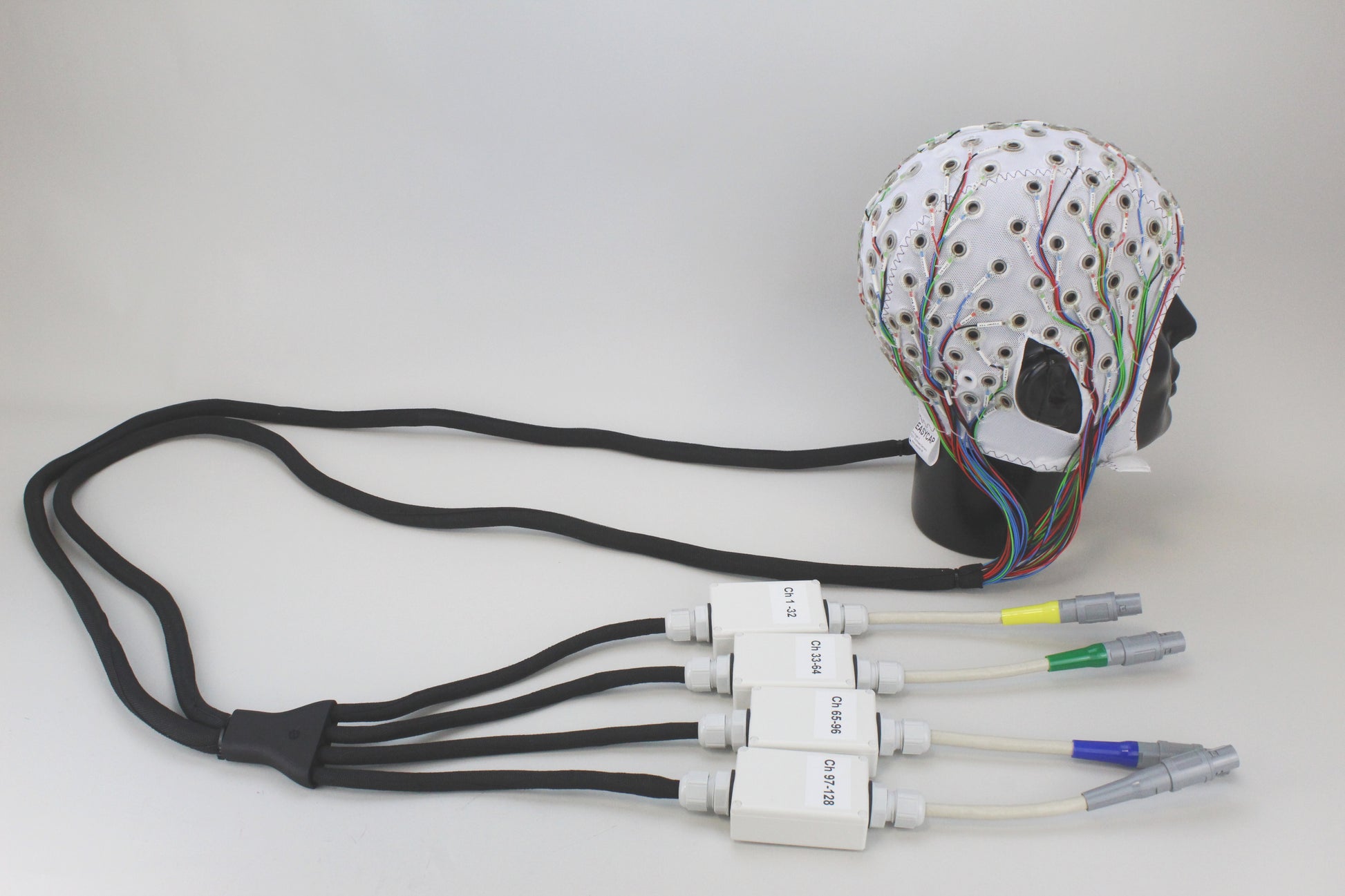Complete EEG recording cap with 128 built-in Multitrode electrodes for MEG, and two loose single socket Multitrode electrodes for MEG (reference and ground).