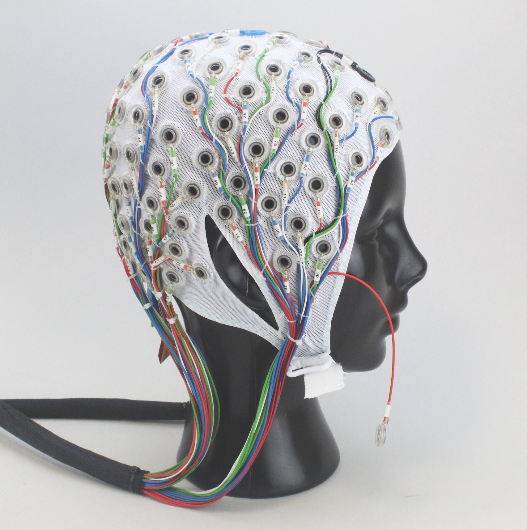 Complete EEG cap with 128 (126 signal electrodes, ground and reference) built-in Multitrode electrodes for TMS.