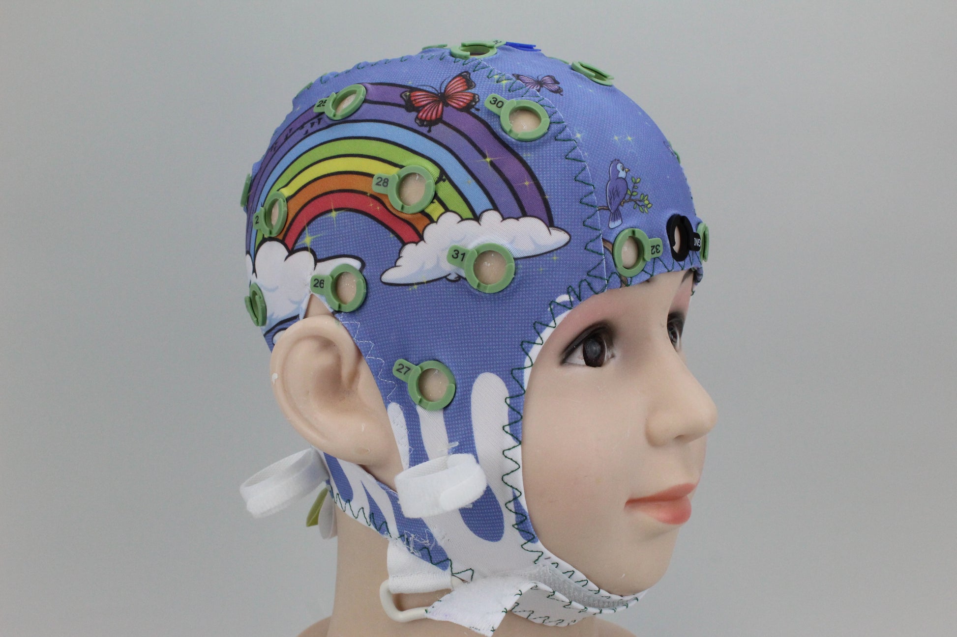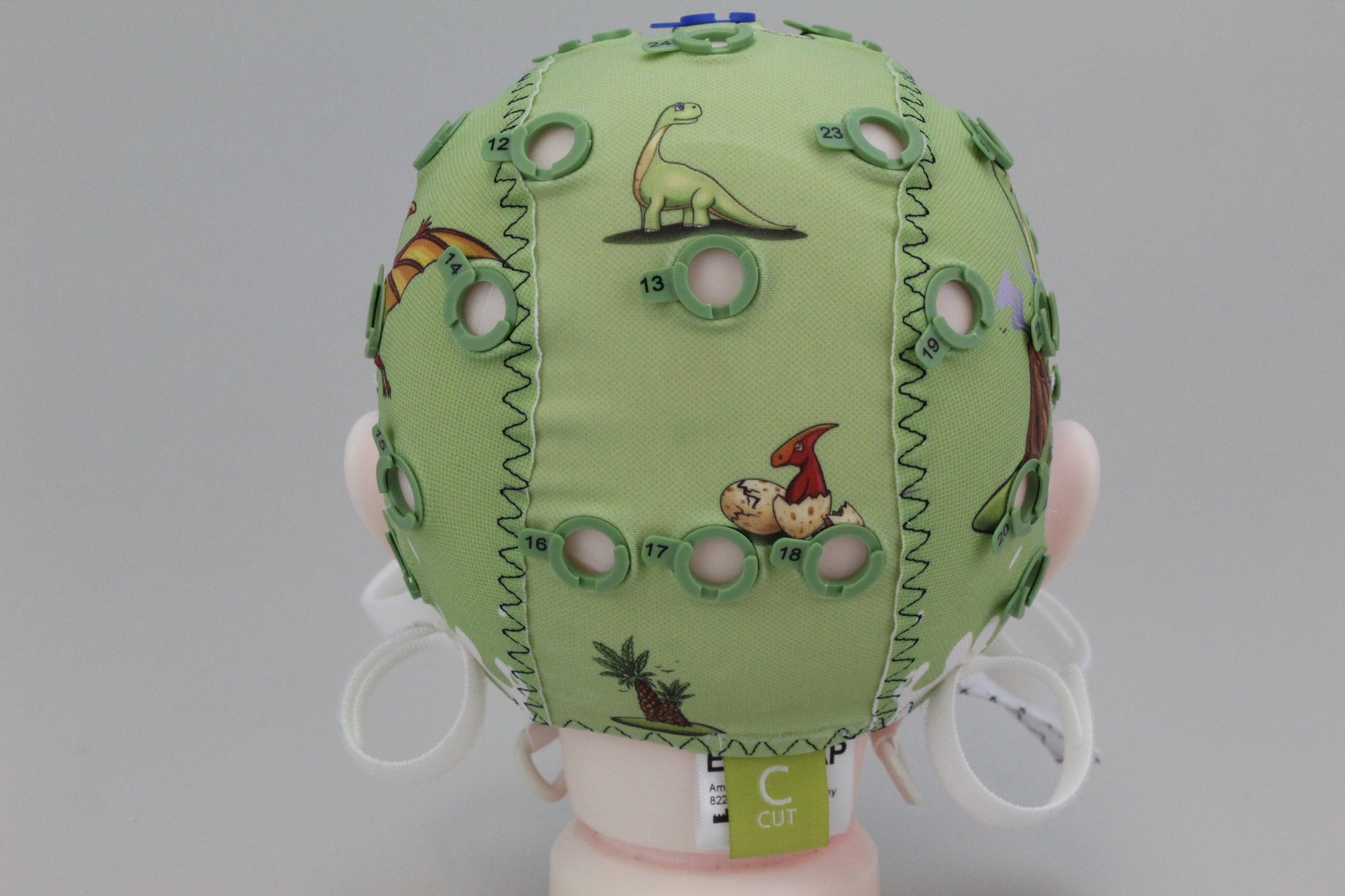 Printed fabric, subinion-type cap with positions selected from the International 10-20 System. The cap has 34 actiCAP Snap holders (32 signal electrodes, ground and reference) suitable for actiCAP Slim Electrodes.