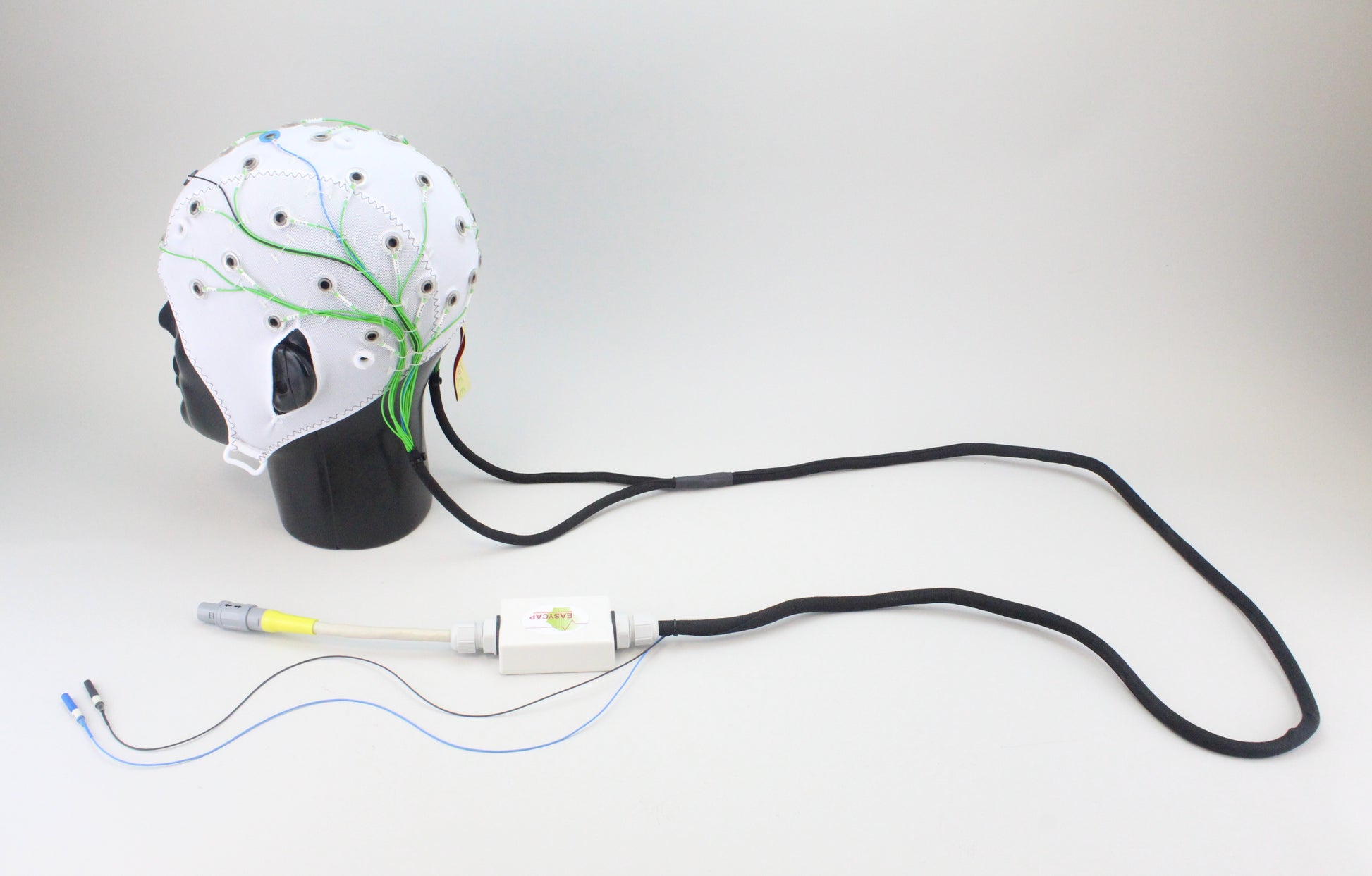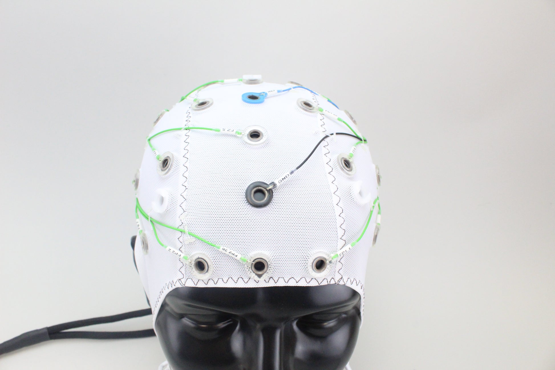Complete EEG recording cap with 34 (32 signal, reference and ground) built-in Multitrode electrodes for MEG.