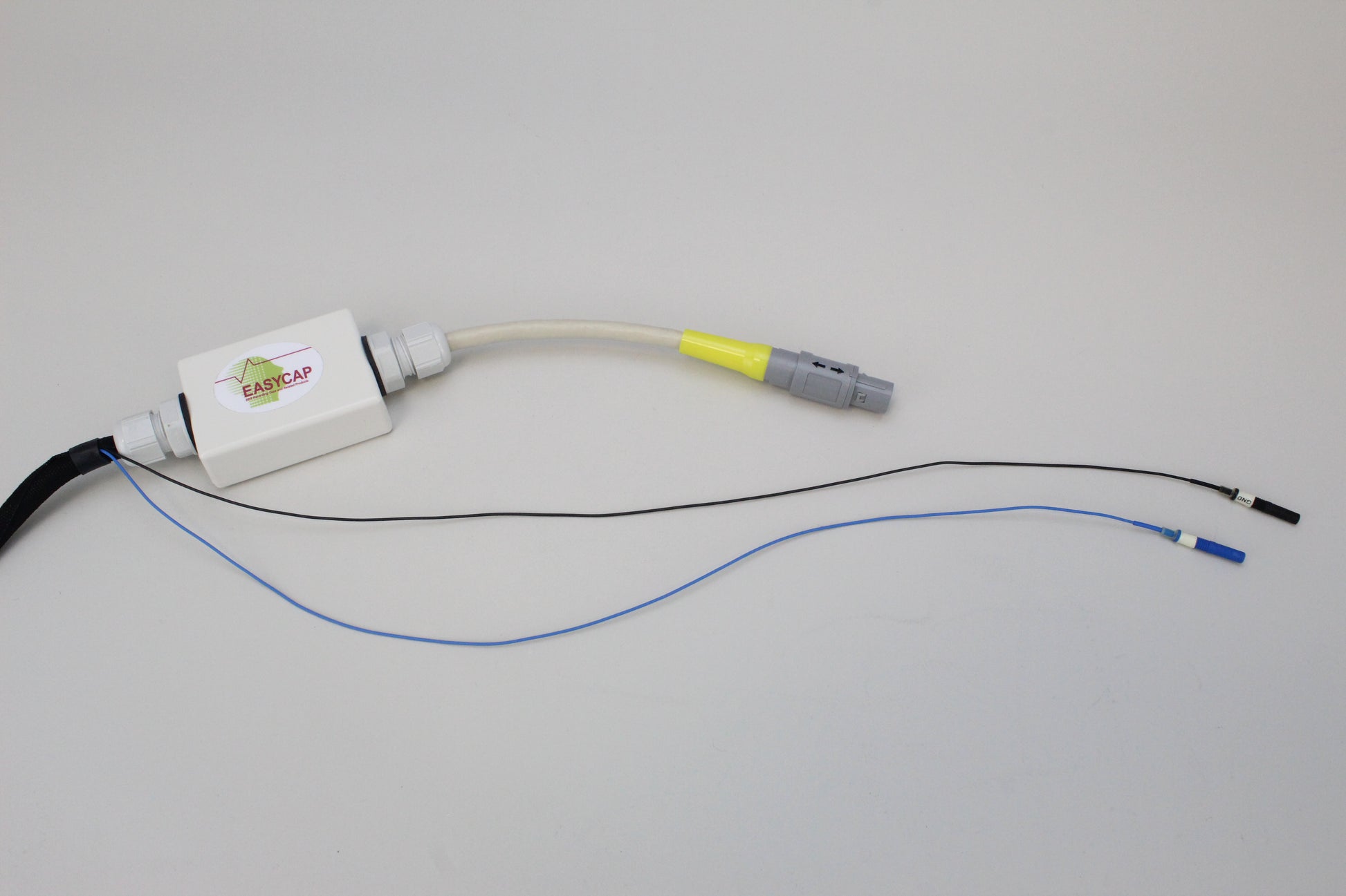 All electrodes are Multitrodes with sintered Ag/AgCl sensors. They are buttoned directly into the cap (total height 3,5 mm) or can be attached to the skin with double-sided adhesive rings. All electrodes are number- and name-labelled at the sensor end. The cap and electrodes are built using methods and parts designed to minimize sources of ferrous or pseudo-ferrous contamination.