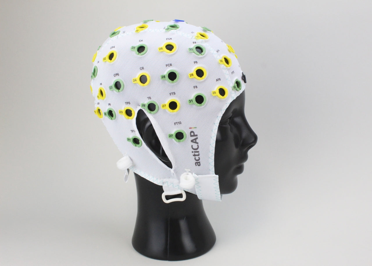 White fabric, subinion-type cap with 66 printed electrode positions selected from the International 10-20 System. The cap has 66 actiCAP Snap holders (64 signal electrodes, ground and reference) suitable for actiCAP Slim Electrodes