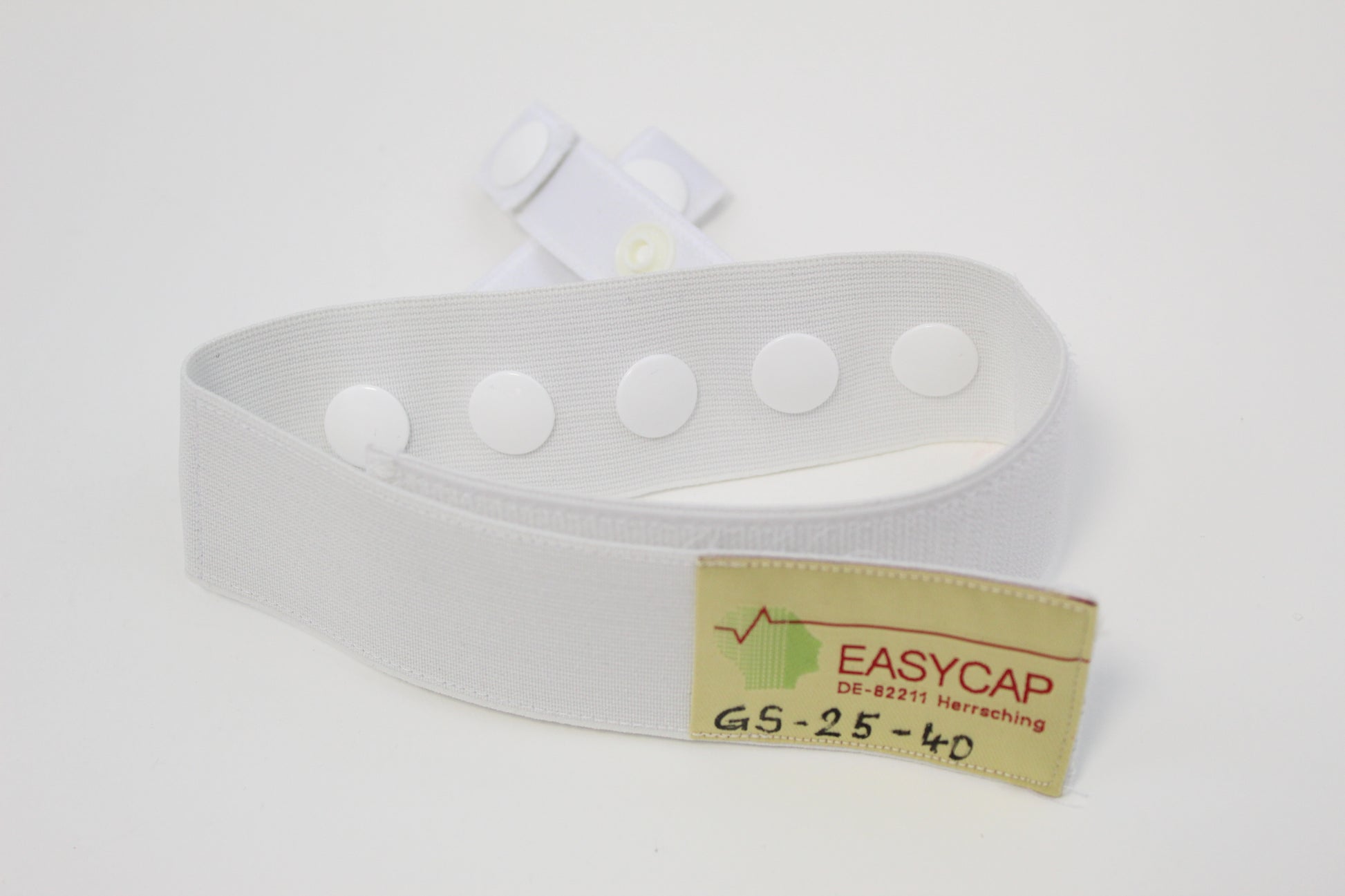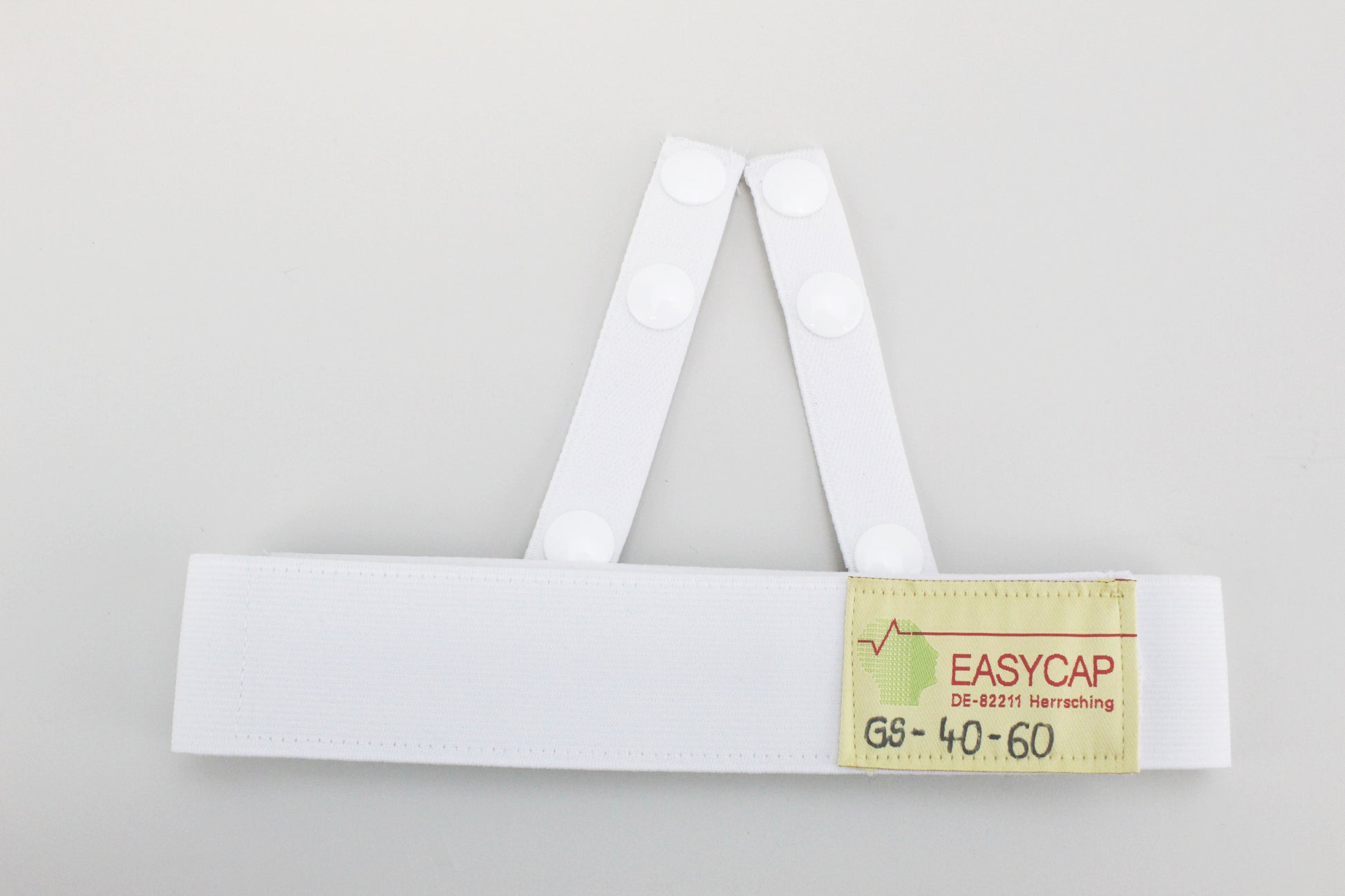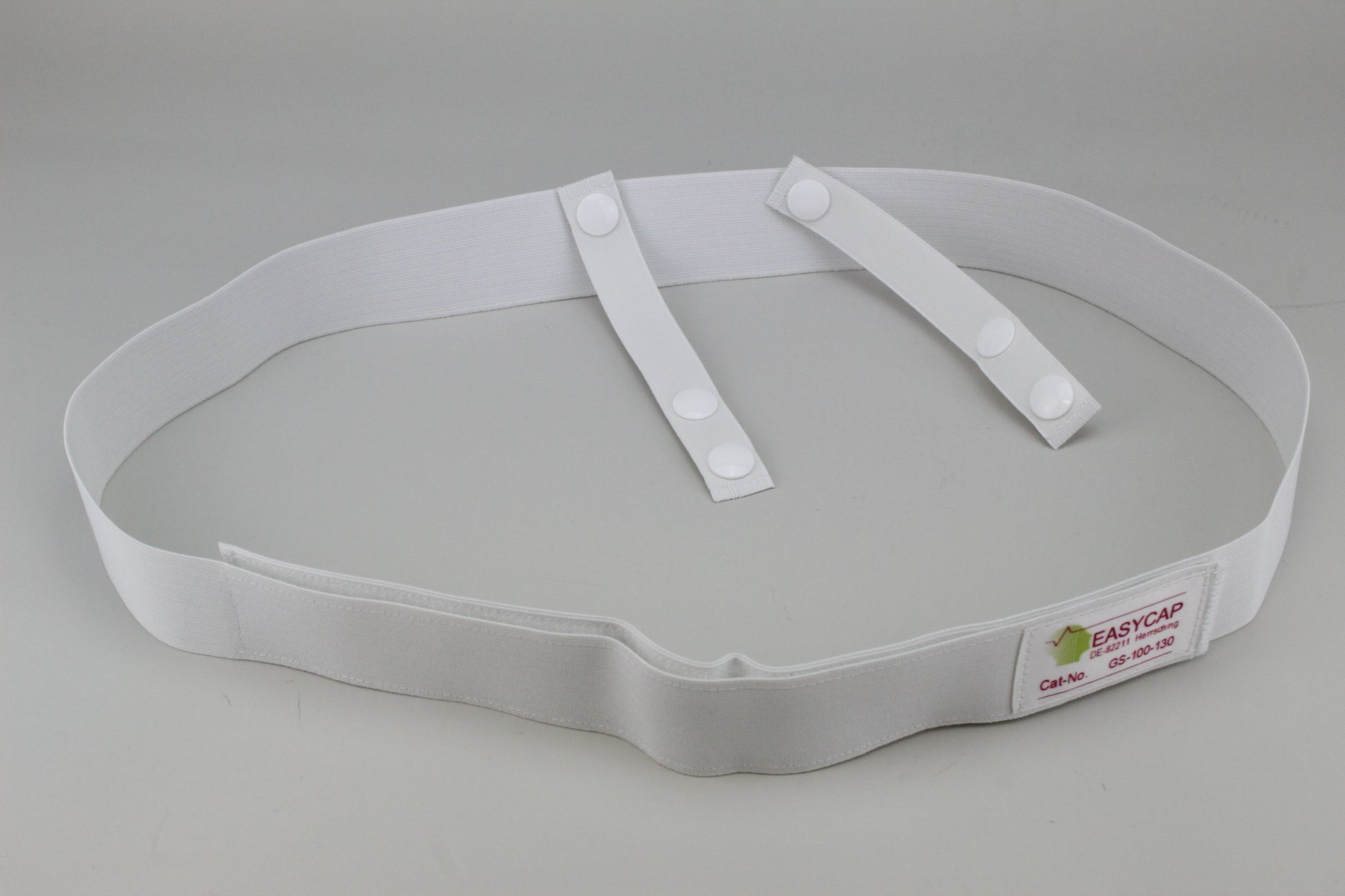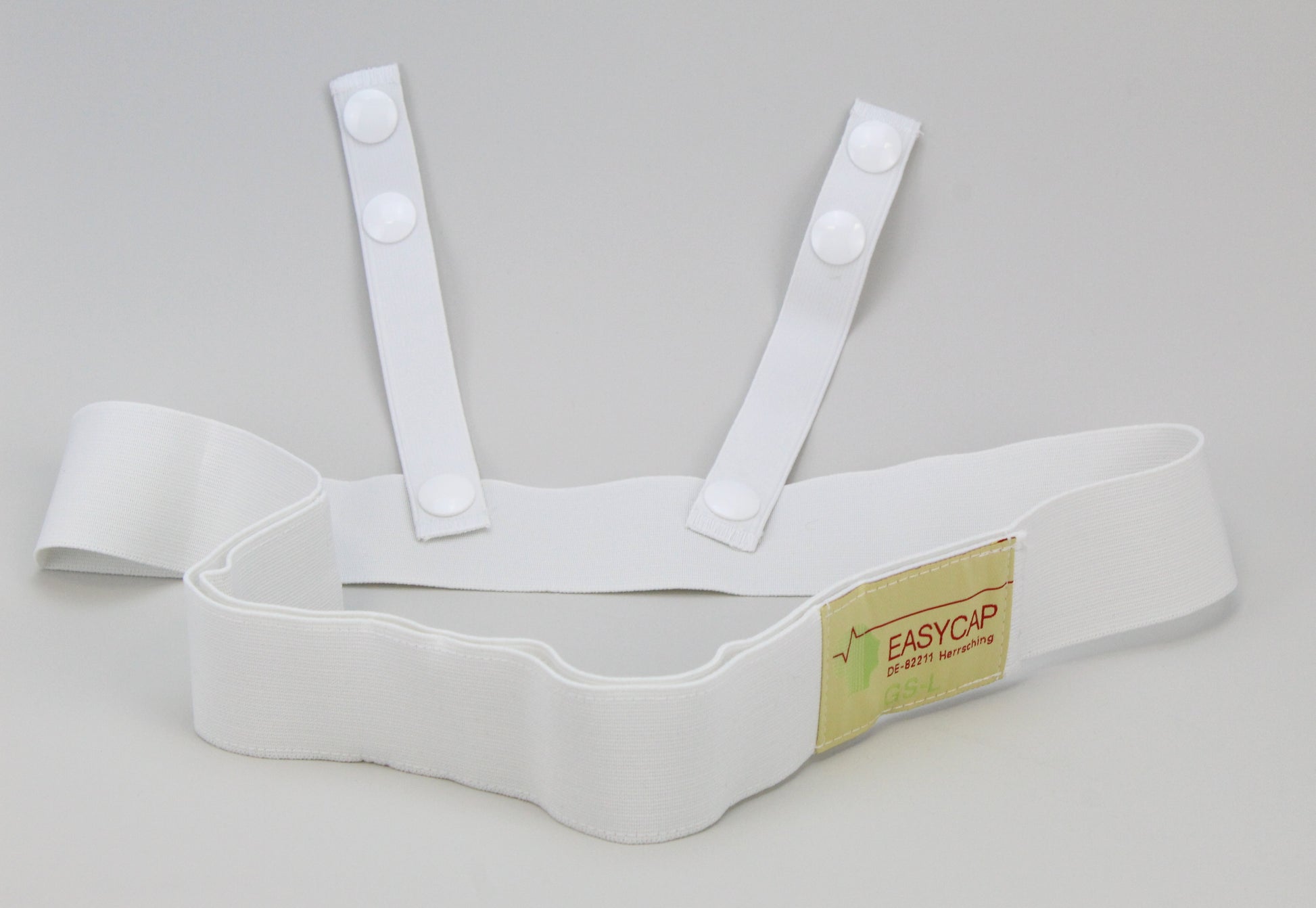 A chestbelt with no magnetic elements for securing a cap to the body of the participant. Insert the small white strips into the plastic buckles at the rim of the cap near the chin strap, and fix these further to the chestbelt around the breast.