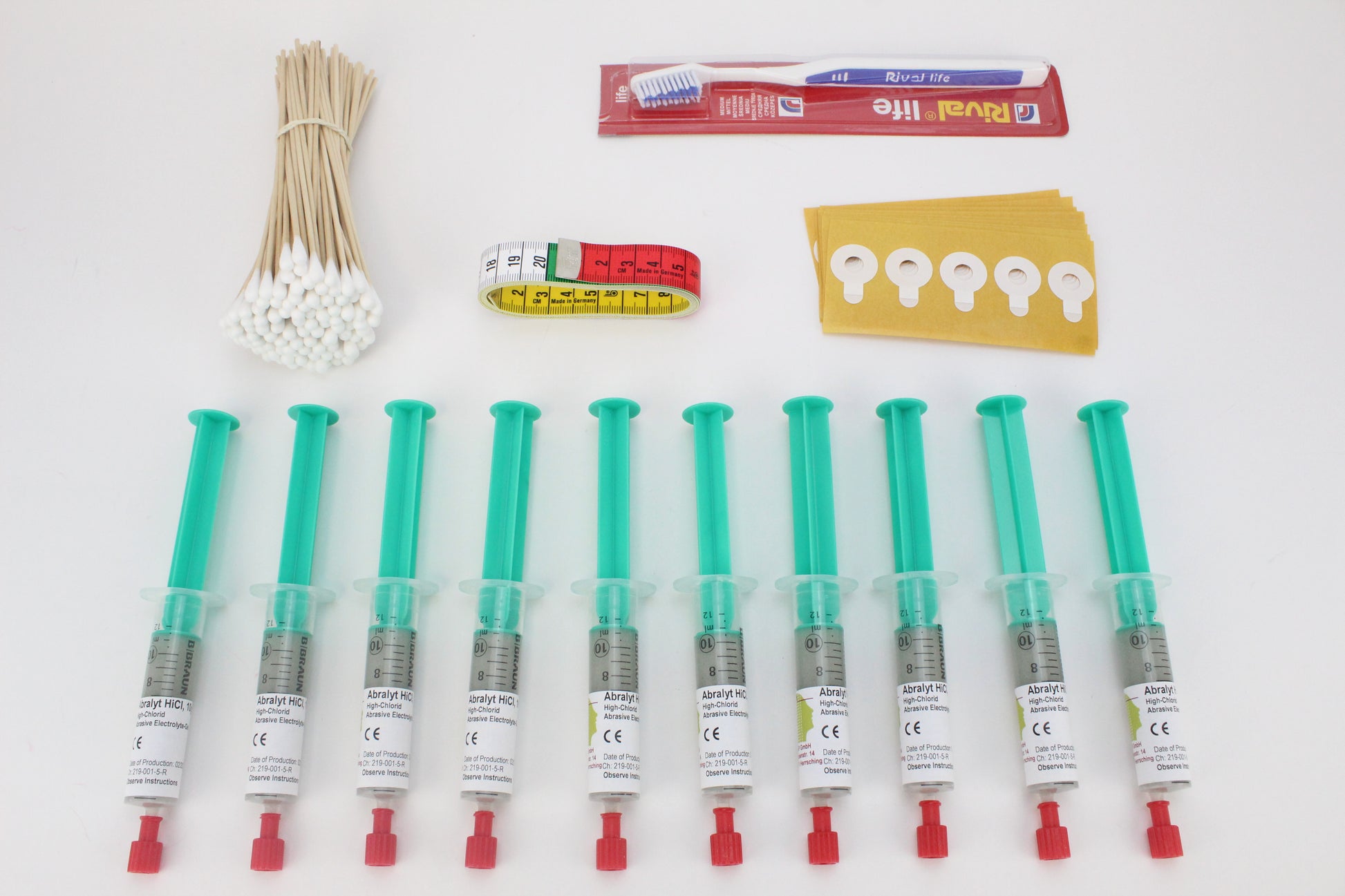 10 filled syringes with Abralyt HiCl, 50 washers, measuring tape, toothbrush for cleaning and cotton swabs