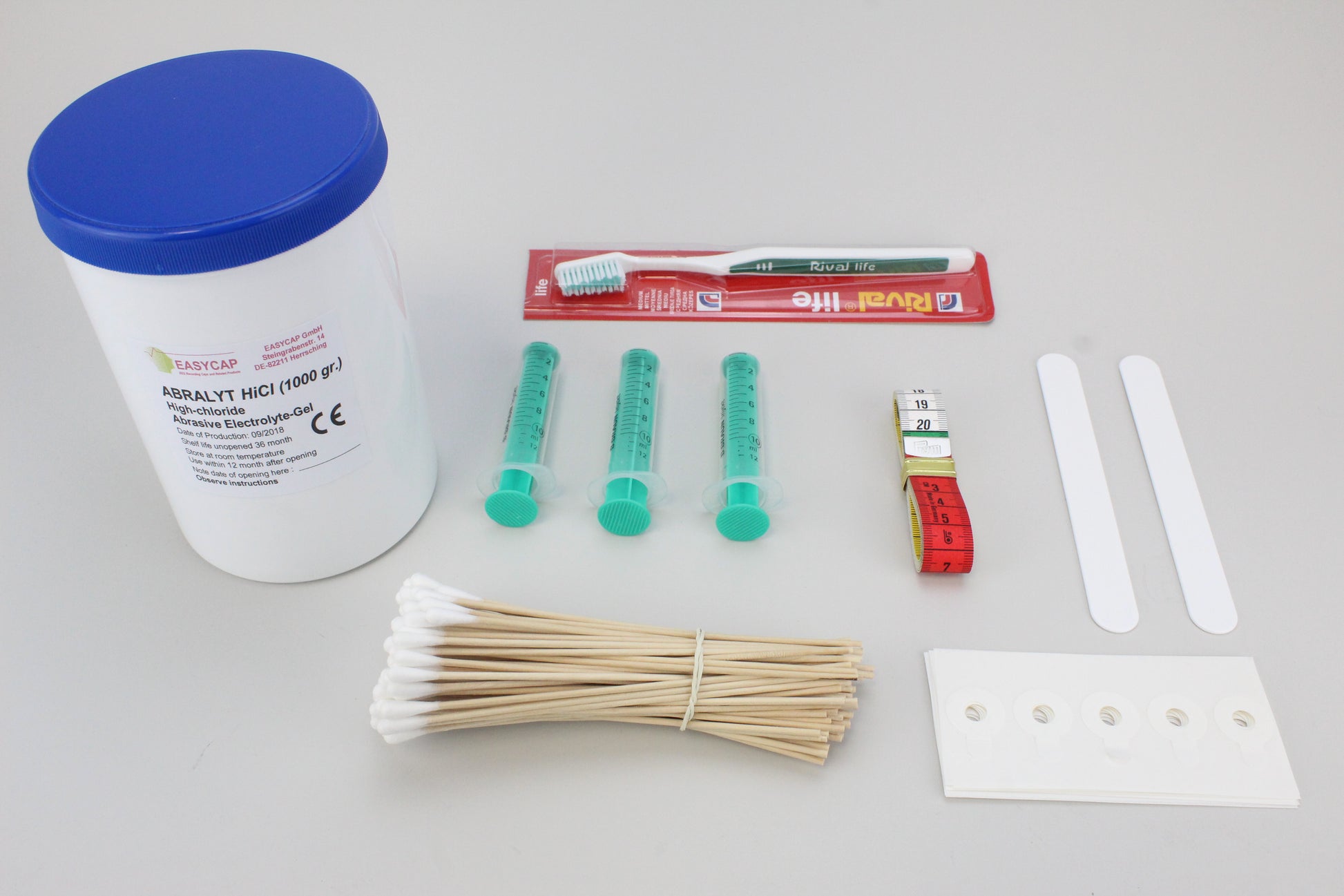 500 g Abralyt HiCl, 5 Multitrode electrodes, 2 syringes, 100 washers, measuring tape, toothbrush for cleaning and cotton swabs
